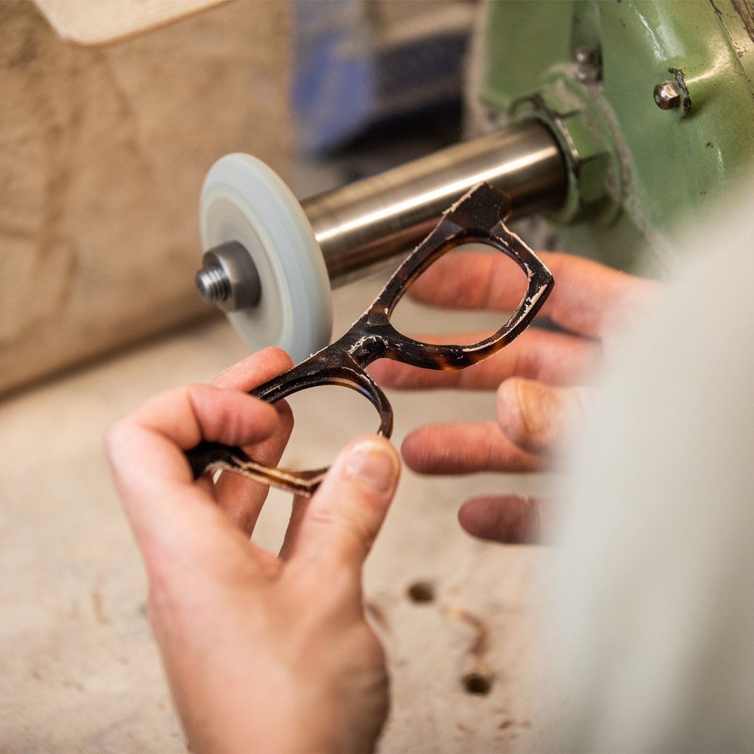 Each frame is made in limited runs taking over 70 hours to produce from start to finish. From setting out the frame shape to cutting, polishing and fitting the lens each step is undertaken by our experienced artisans. Our small British work shops celebrate the long history of eyewear making in the UK and still maintain and use machines and tools with a history from deep in the mid 20th Century alongside the best in contemporary machining processes.
